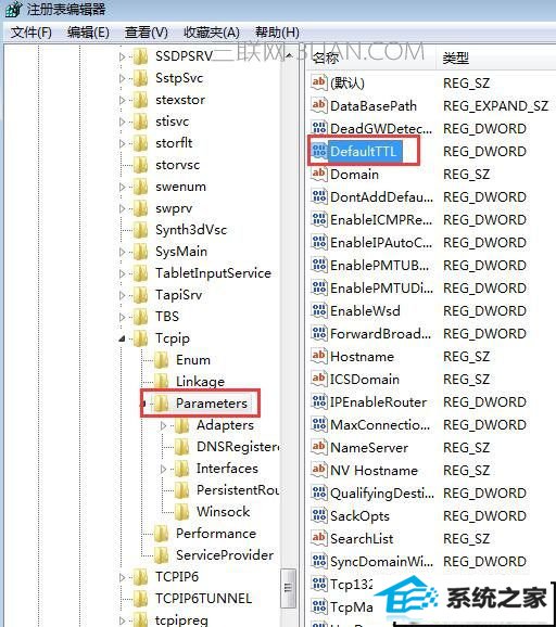 2、注册表编辑器打开后,我们就可以在其中进行注册表编辑了,我们定位到:HKEY-LoCAL-MACHinE/sYsTEM/Controlset001/services/Tcpip/parameters 项下;