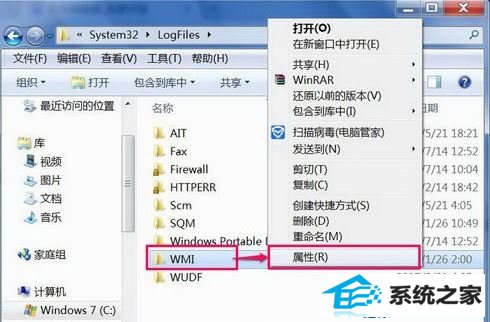 4、在“LogFiles”里面找到这个“wMi”文件夹,在此文件夹上右键,打开“属性”;